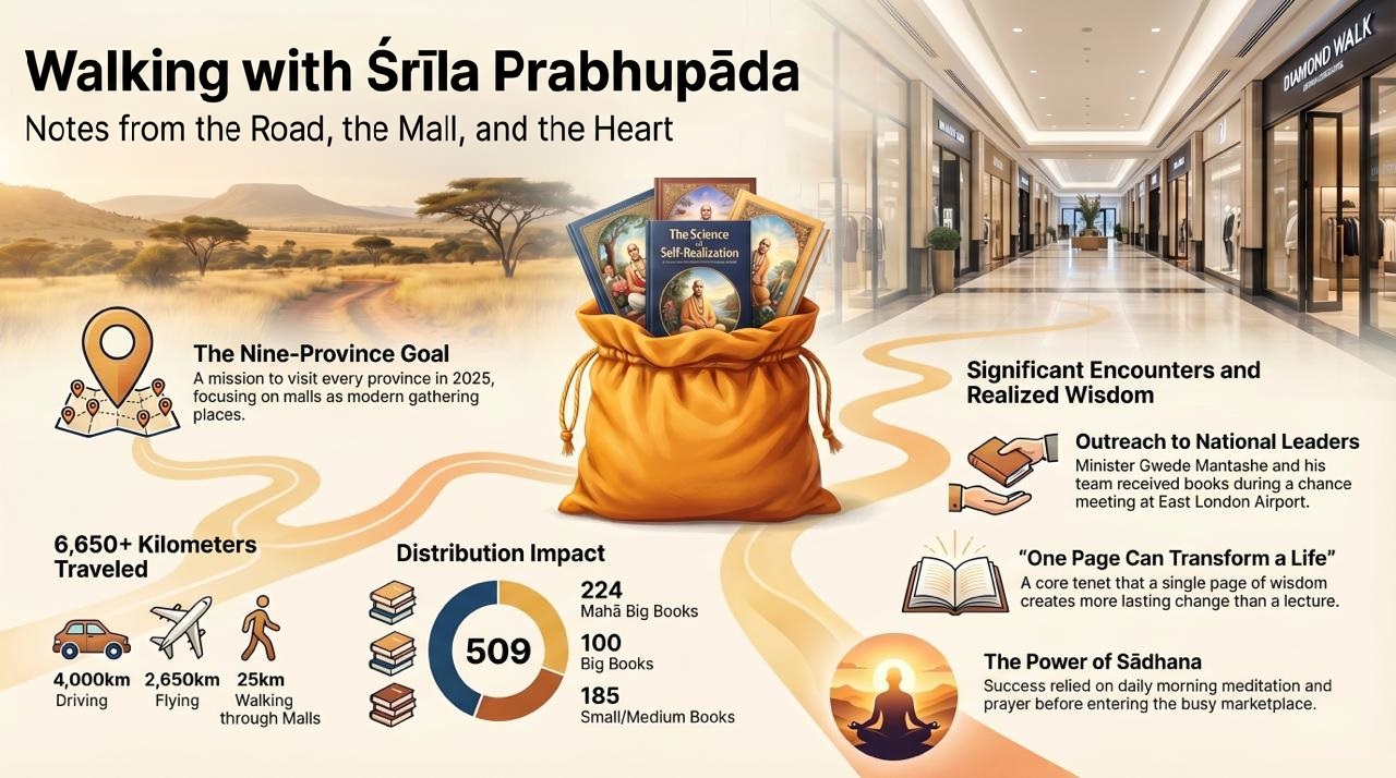 This book describes the journey through a 4000 km spiritual marathon touching all 9 provinces of South Africa with the transcendental books of Srila Prabhupada. My (Vibhu Caitanya) mission was to see if, amidst the bustle of the malls and the fatigue of the tarmac, these seeds of bhakti could still find a place to grow.